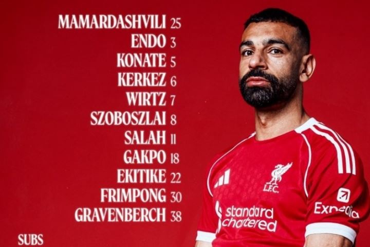 利物浦首发:25--玛玛达什维利、5-科纳特、6--科尔克兹、30-弗林蓬、38-赫拉芬贝赫、3-远藤航、7-维尔茨、8-索博斯洛伊、18-加克波、11-萨拉赫、22-埃基蒂克